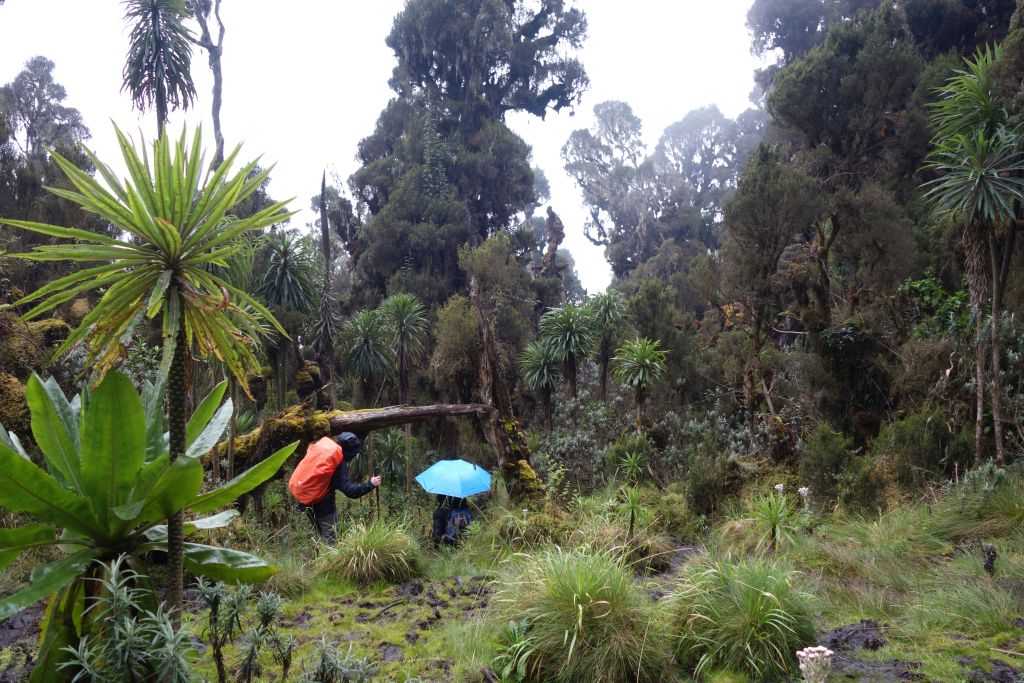 After a short drive to the starting point of the trek, guides, porters and cooks will be selected for the tour in Nyakalangija. After a leisurely hike, first through the village and past banana plantations, the national park boundary is reached after 1.5 hours. With a bit of luck, you can see chameleons in the fern or blue monkeys in the trees. In any case, one is accompanied by many and beautiful butterflies. Along the Mubuku Riber we continue through forest and open fern landscape. After a 4-5 hour hike, the Nyabitaba Hut (2,650 m) is finally reached. The Nyabitaba Cabin lies directly in the forest on a mountain slope and offers a beautiful view of the Portal Peak. Overnight in the Nyabitaba Hut