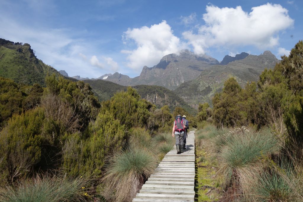 After a 1.5-hour hike down through the forest and green fern landscape, the suspension bridge over the Bujuku River is reached. There it goes steeply uphill through dense vegetation as well as over roots and stones. The more you gain in height the more moss-hungry and mystical the scenery becomes. At the end of the walk open moor areas with giant lobelia are reached. A short distance over wooden planks along the lakeshore, after a total of 6 hours of walking you will reach the John Matte Hut (3.480m). Overnight at the John Matte Hut