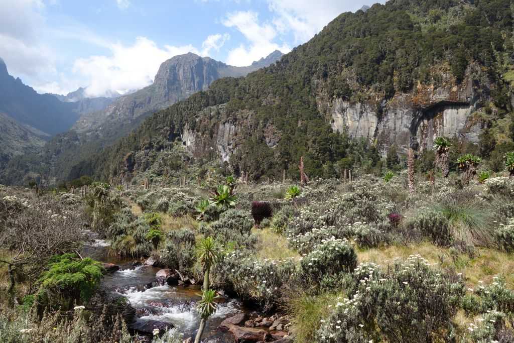 After a short drive to the starting point of the trek, guides, porters and cooks will be selected for the tour in Nyakalangija. After a leisurely hike, first through the village and past banana plantations, the national park boundary is reached after 1.5 hours. With a bit of luck, you can see chameleons in the fern or blue monkeys in the trees. In any case, one is accompanied by many and beautiful butterflies. Along the Mubuku Riber we continue through forest and open fern landscape. After a 4-5 hour hike, the Nyabitaba Hut (2,650 m) is finally reached. The Nyabitaba Cabin lies directly in the forest on a mountain slope and offers a beautiful view of the Portal Peak. Overnight in the Nyabitaba Hut