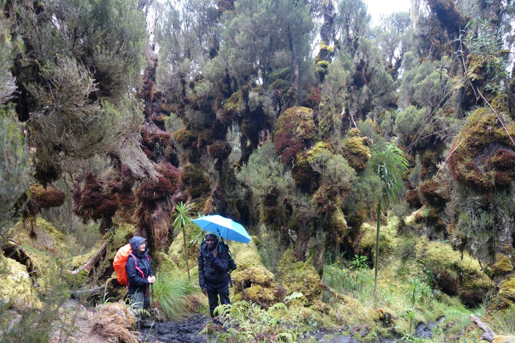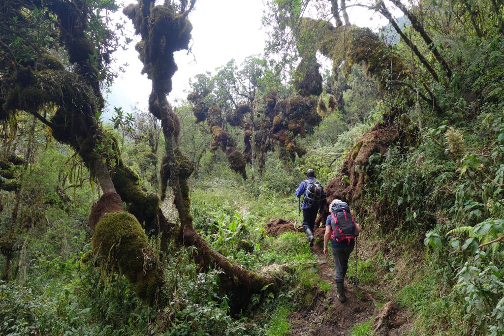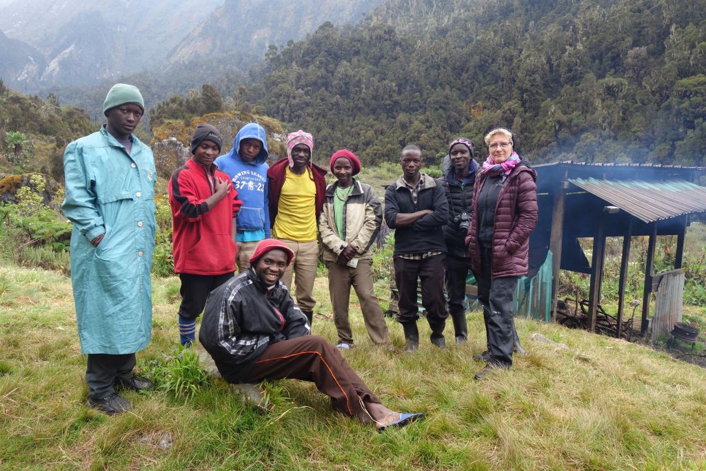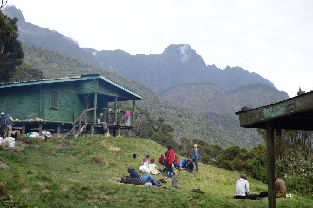 At 9:00 am we drove from the hotel to the starting point of the trek in 30 minutes. Here there was already busy, luggage was weighed and repackaged. Through an information board we were informed about the course of the trek, otherwise we enjoyed the warm sunny summer day and the excitement before the start. After registering and weighing our luggage, accompanied by Hezron and observation of the villagers, we went through the village towards the entrance to the National Park. On the way we met many villagers, carrying all sorts of luggage, most of the firewood. Again and again children called us in the fields a friendly Hello. On the way surprisingly many and beautiful butterflies flew past us. After reaching a picnic spot, it was a good 2 hours uphill, at 25 ° C through forest and open areas to the Nyabitaba hut (2,650m). The cabin is located in the middle of the forest and offers a beautiful view of the Portal Peak.